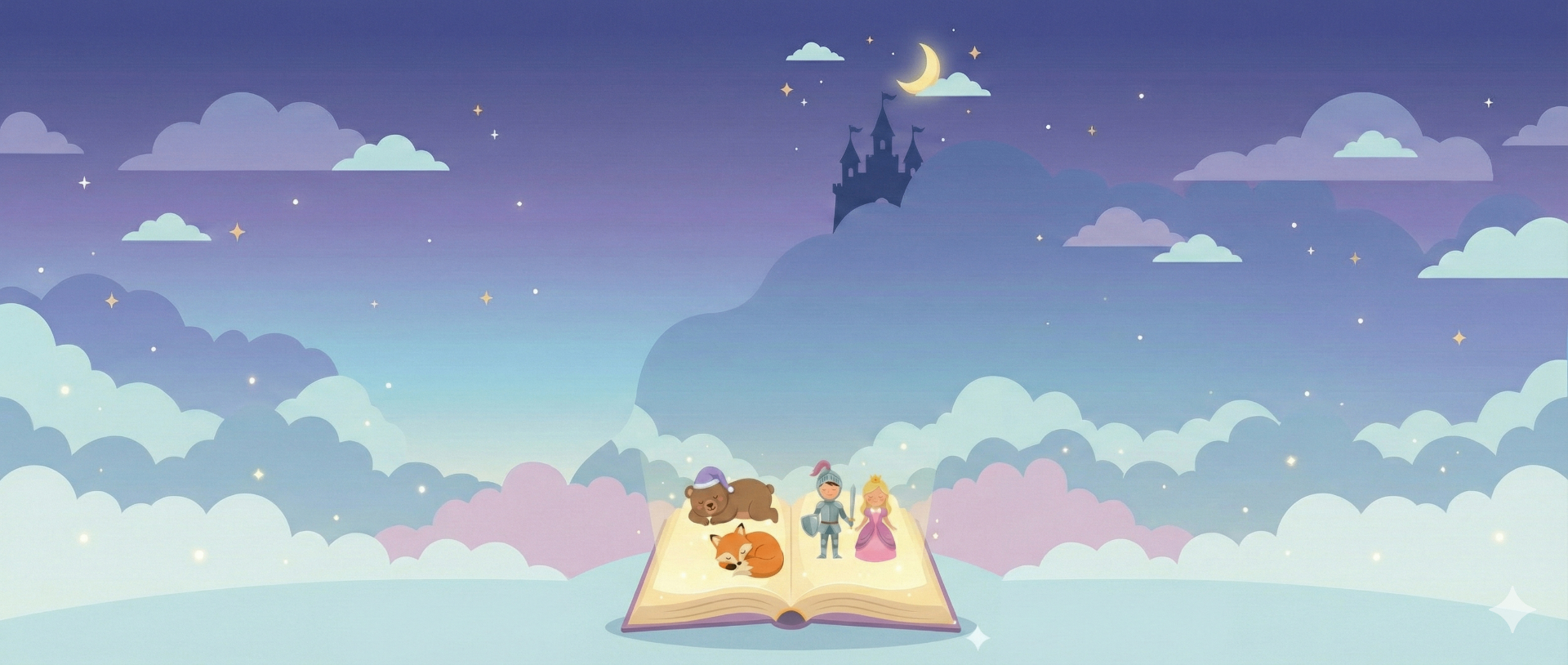 Lad fantasien styre! Vælg 3 ting, og se dem blive til en unik godnathistorie med flotte billeder og stemme, helt automatisk.